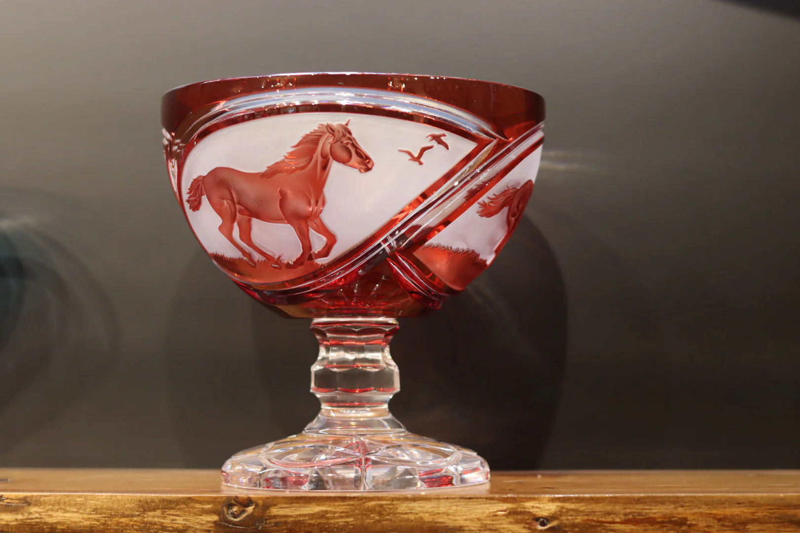 Introducing the Master Bowl in Celtic Flame design. Each piece is hand-cut and adorned with a stunning, multi-layered sandblasting of galloping horses on three panels. This laborious process produces uniquely exquisite pieces. Very Limited numbers available in each colour annually. 22.5cm in height, 22cm width. Elevate your home decor with this exclusive masterpiece.